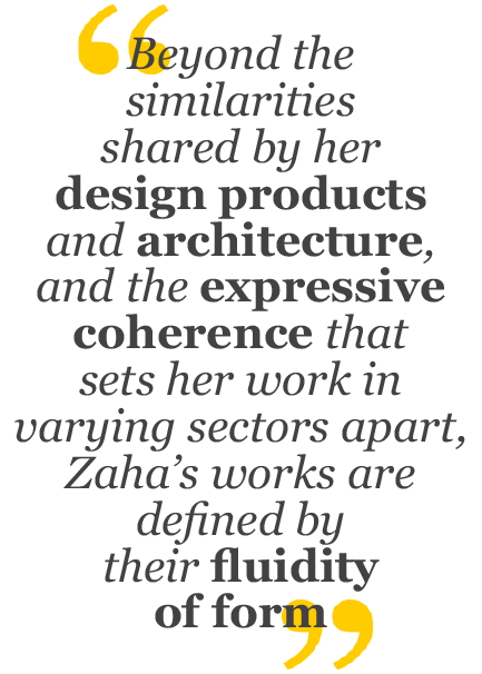 Zaha Hadid created a series of extraordinary sofas and tables for diverse furniture companies, including Edra, Sawaya&Moroni, B&B, Established&Sons, as well as design museums, including London’s David Gill Gallery. Beyond the similarities shared by her products and architecture, and the expressive coherence that sets her work from varying sectors apart, Zaha’s design is defined by its fluidity. It is not the typical, streamlined American style, but that of the undulating sands of a desert landscape, almost as if her works bear the mark of her origins. Zaha’s design is fully expressive, both in its digital aesthetics that appear natural instead of artificial, and in its ability to interpret a material’s essence.