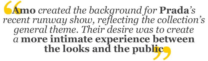 Prada’s men’s and women’s 2017/18 Fall/Winter runway show was set against a background created by Amo, who defined the collection through their intentional, simple quotidian installation. Their desire was to create a more intimate experience between the looks and the public by demonstrating a sense of sobriety. A continuous dividing wall separating the space into a series of consecutive scenarios. The woodwork sinuously flows along the perimeter of the space, staging further intimacy. The domestic dimension is highlighted by the mix of wood and popular materials of the moment, including terrazzo tiling and formica, with only somber benches and spartan beds. The installation is an ideal counterpoint to the runway presentation, based on the everyday simplicity.