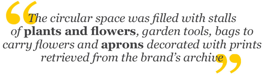 In Milan, during the autumn fashion week, Marni gave impetus to their twenty years celebrations with a poetic flower market at the Rotonda della Besana, in collaboration with the children’s museum. The circular space was filled with stalls of plants and flowers, garden tools, bags to carry flowers and aprons decorated with prints retrieved from the brand’s archive. Everything was for sale. The dialogue between the Marni creations, prepared for the occasion, and the flowers for sale was the central theme of this original charity initiative. On sale also new multiples of the animal-sculptures in metal and PVC, handmade by a group of Colombian women.